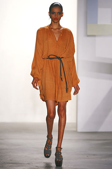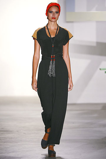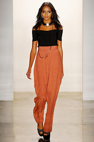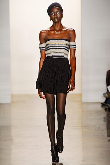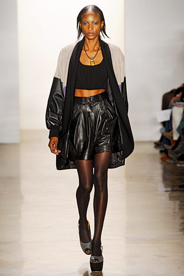 For Fall ’11, Lisa Mayock and Sophie Buhai did what they do best — quirky ethnic touches, edgy cutouts, badass leather, silky fabrics, and dark, brooding hues. The Vena Cava aesthetic — off-kilter clothes for equally standout girls — remains the same, but new hemlines arose via mid-length skirts and fitted maxi dresses. And clearly designers are also into the decolletage for the upcoming season; off-shoulder tops revealed svelte arms and long necks, while bottom halves remained fairly covered with trousers and long skirts. A couple polka-dot pieces popped up, revealing Vena Cava’s softer side.