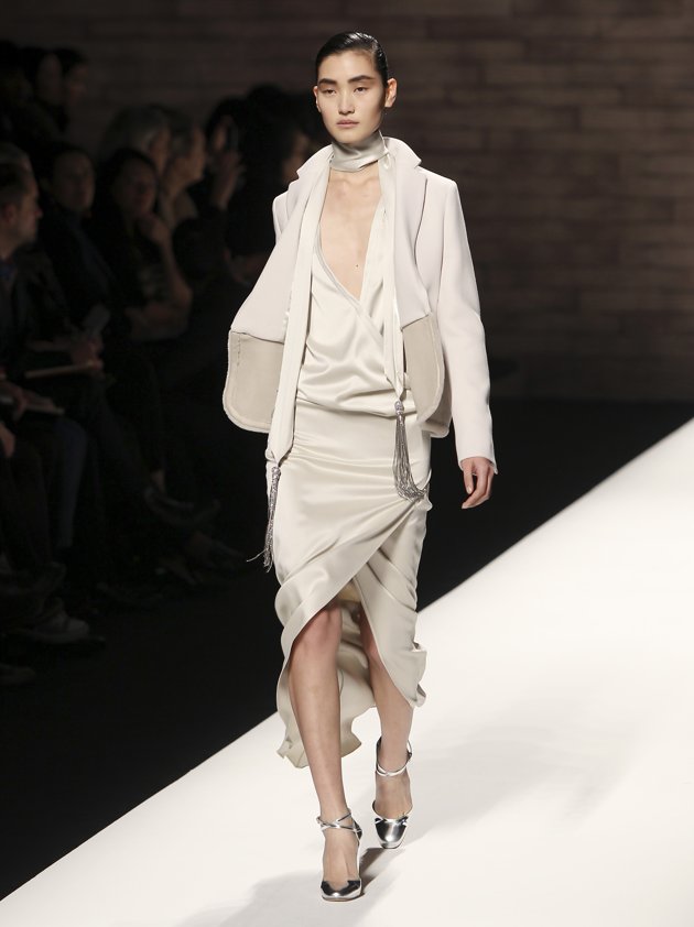 Later the show morphed into lighter, nude tones, mixing jersey and silk, pistachio dresses in guipure, and plenty of belting. There were a couple of sexier numbers too, including plunging Y neck cocktail dresses in black silk worn with a visible camel bra, or crystal embroided skirt-suits.