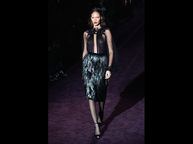 Giannini played on transparency by using lots of velvet which made up appliqué flowers on translucent chiffon and lace blouses. She showed us silk dresses featuring barely there floral prints of fading tulips or pale yellow flowers that fanned stiffly. When worn with simple heeled sandals these frocks gave the collection an romantic side in a dark palette ranging from black,purple, burgundy, navy, forest green, dark olive and brown. Furthermore, dresses and skirts were smothered in feathers that gave off an inky glow. All dark glamour. The closing dresses appeared one after another: jewelled chiffon evening gowns – their embellishments in dark green or purple encrusting the entire bodice or simply gathering at the shoulder and hip while leaving the back bare.