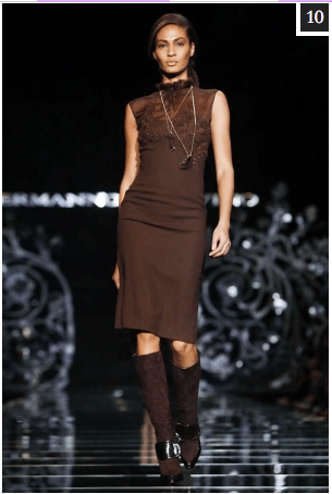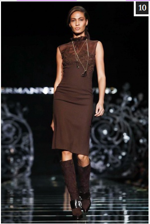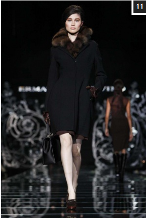 When Ermanno Scervino’s models came marching down the runway for the Fall Winter 2012/13 collection it seemed as if the cavalry had arrived. Strong looks and somber colours; olive, khaki and moss greens dominated the first part of the show along with heavy winter coats and high-waisted trousers tucked into knee-high boots. Bottle green was another shade that made its way onto a number of pieces including a structured pleated skirt and figure hugging dress.
