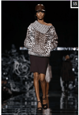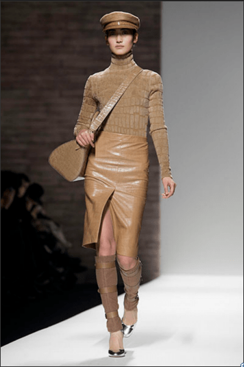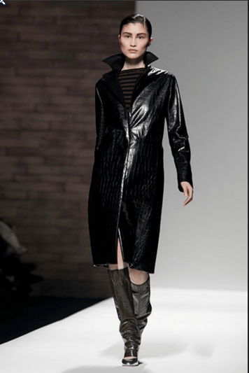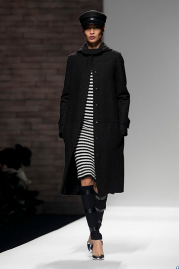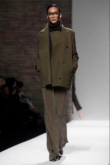 At Max Mara: Military coats, duffle coats and toggle sweaters all combine to make up a bold collection for a woman who likes to be in control, and at the same time dares to be different. Leather and alligator print inserts in a dropped waist and leather half-belts accentuate the military feel of the collection.