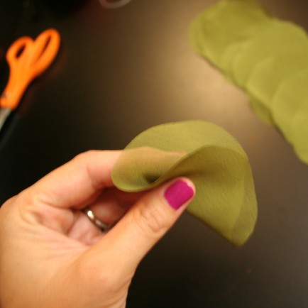 Repeat the fold-fold-stitch process with 7 more circles. You should have a stack that looks something like the above photo. Knot the thread a few times to secure the stack, and you will see the fabric form a little ruffled cluster.