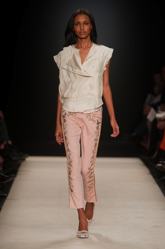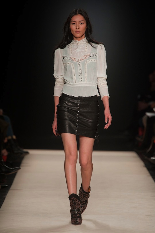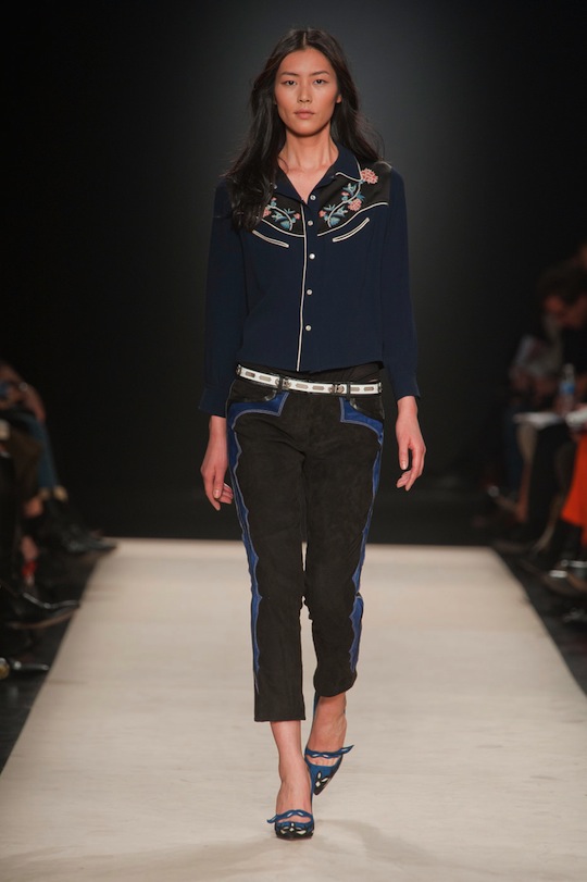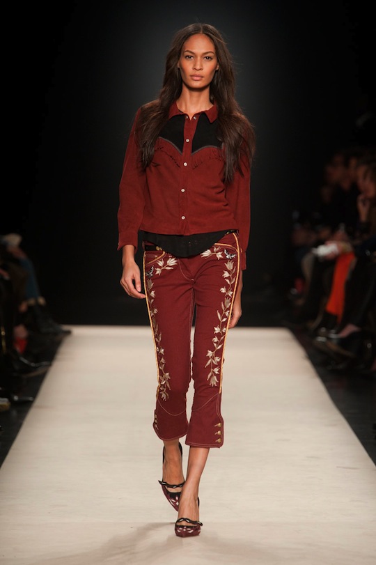 Devotees of the brand, which include the A-list roster of models who walked in the show (including Carmen Kass, Anja Rubik, Joan Smalls, Arizona Muse, and the list goes on), won’t be disappointed with fall’s Western-inspired offerings. Because somehow, Marant makes cowgirl floral embroidered silk button downs look insanely cool. Part of that cool-factor has to do with those models who wear her clothes both on the runway and off. (We overheard a story about one photographer who said he couldn’t tell when Marant’s models were in first looks because they all come to the show wearing Marant to begin with).